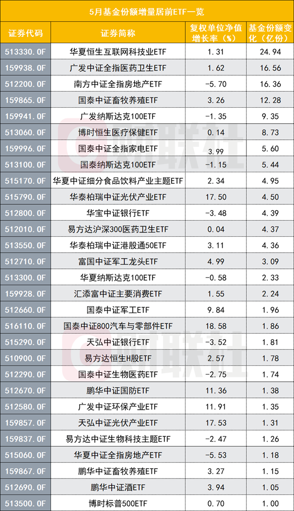 具体来看,随着光伏、新能源赛道的回暖,一些相关主题ETF的基金份额、规模也创下新高;从高位回调的房地产板块吸金效应不减;此外,恒生互联网科技、医药卫生等ETF在5月基金份额增量居前。