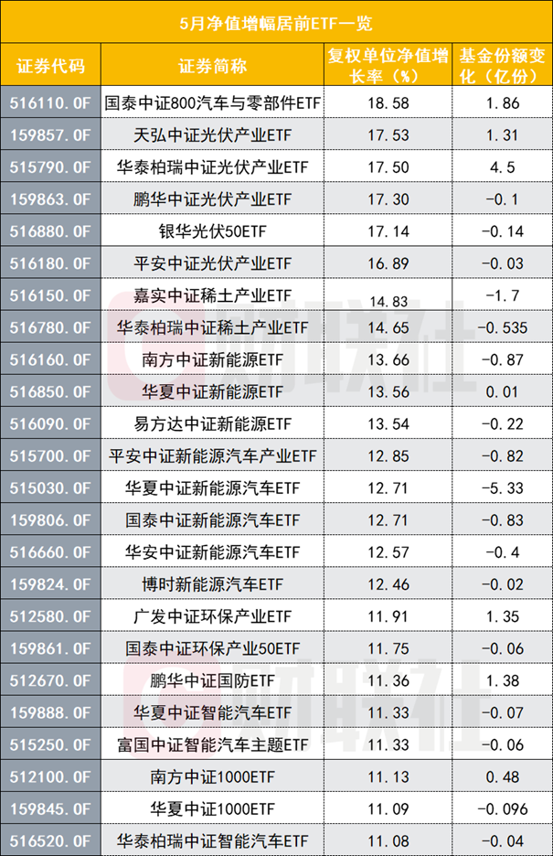 截至5月底,国泰中证800汽车与零部件ETF单月累计涨幅最高,达18.58%;其次是天弘中证光伏产业ETF,累计涨幅为17.53%;华泰柏瑞中证产业ETF、鹏华中证光伏产业ETF、银华光伏50ETF等在5月也涨超17%。
