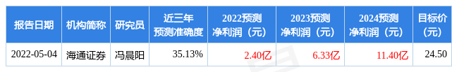 证券之星数据中心根据近三年发布的研报数据计算,海通证券(600837)冯晨阳研究员团队对该股研究较为深入,近三年预测准确度均值为35.13%,其预测2022年度归属净利润为盈利2.4亿,根据现价换算的预测PE为69.22。