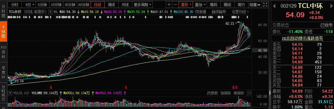 TCL中环今年股价表现相对较强,6月下旬以来股价一度加速上涨,最高价冲破60元,创出历史新高,股价现报54.09元,今年整体上涨29.9%,截至目前,总市值为1748亿元。