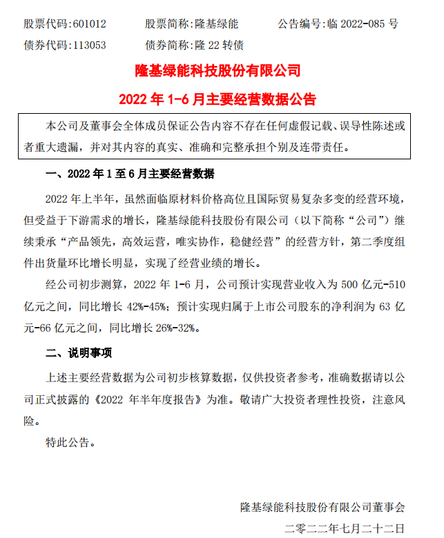 在公告中,隆基绿能还提到,2022年上半年,虽然面临原材料价格高位且国际贸易复杂多变的经营环境,但受益于下游需求的增长,公司第二季度组件出货量环比增长明显,实现了经营业绩的增长。