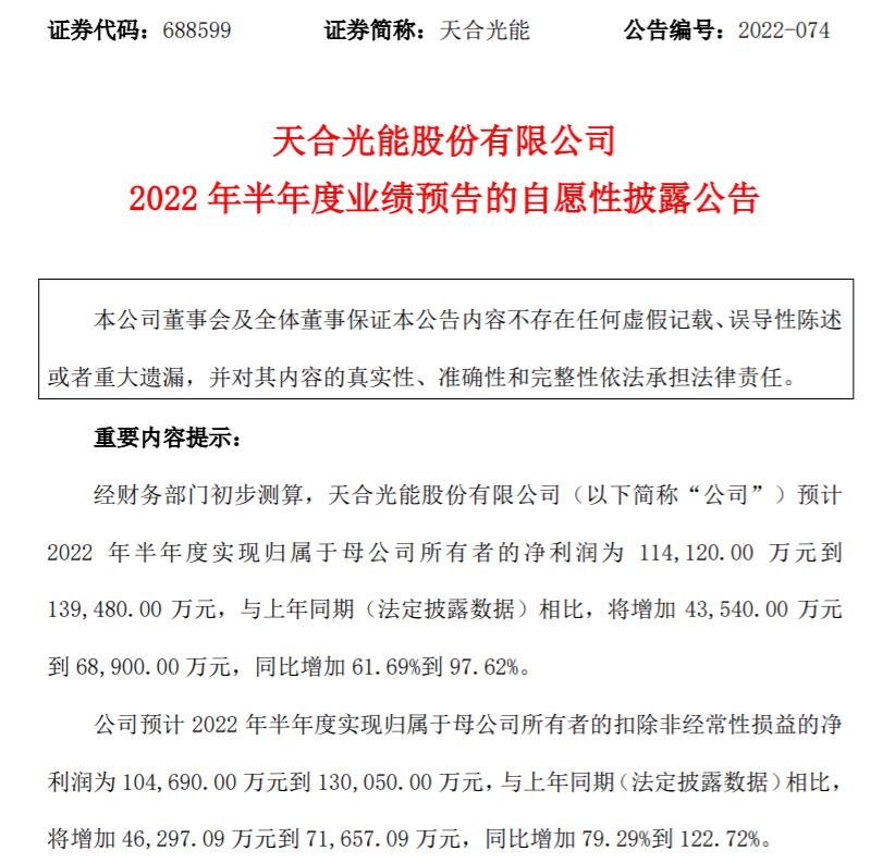 挖贝网7月22日,天合光能(688599)发布2022年半年度业绩预告:预计2022年半年度实现归属于母公司所有者的净利润为114,120.00万元到139,480.00万元,与上年同期(法定披露数据)相比,将增加43,540.00万元到68,900.00万元,同比增加61.69%到97.62%。