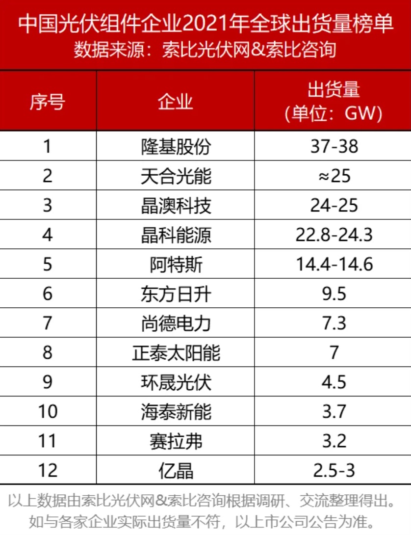据索比咨询《中国光伏组件企业2021年全球出货量榜单》数据显示,中国光伏企业在全球出货榜上名列前茅,出货量合计约140GW,占全球组件总需求的75%以上,硅片的市占率高达97%,全球光伏各产业的榜单中,排名前十的几乎都为中国企业。