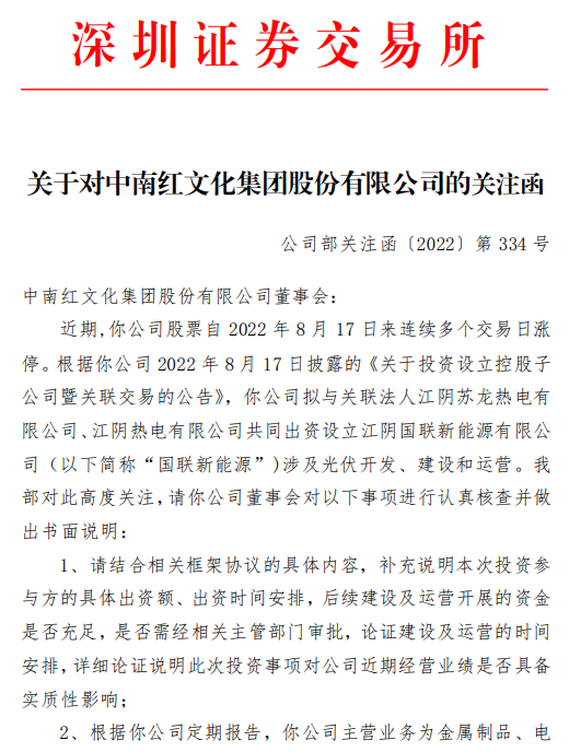 8月22日晚,中南文化收到深交所问询函,根据关注函,深交所要求中南文化结合相关框架协议的具体内容,补充说明本次投资参与方的具体出资额、出资时间安排,后续建设及运营开展的资金是否充足,是否需经相关主管部门审批,论证建设及运营的时间安排,详细论证说明此次投资事项对公司近期经营业绩是否具备实质性影响。