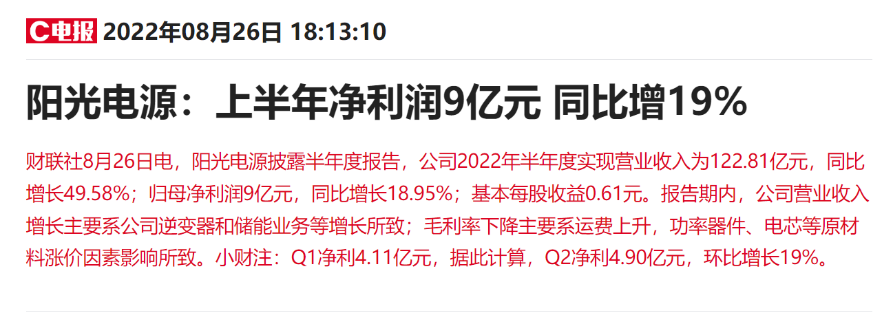 财联社8月27日讯(编辑 王舒蕾)总市值接近2000亿元的全球光伏逆变器龙头阳光电源昨晚披露半年报,上半年实现营业收入122.81亿元,同比增长49.58%,归母净利9亿元,同比增长18.95%。据测算,Q2净利4.9亿元,环比增长19%。