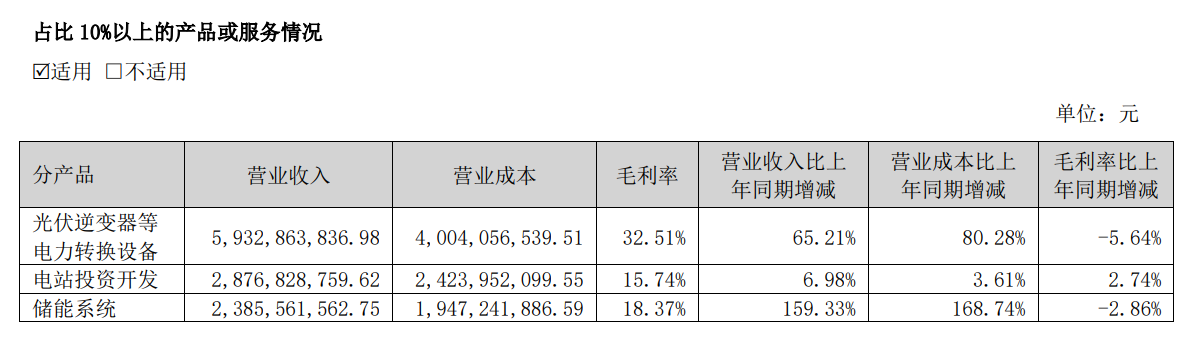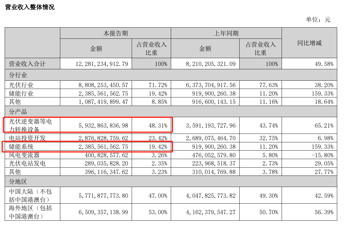 公开资料显示,阳光电源是全球光伏逆变器龙头,主营业务包括光伏逆变器、储能系统、水面光伏系统、氢能业务等,其中逆变器业务营收占比接近50%,储能系统业务营收占比由上年同期的11.2%增长至19.42%。