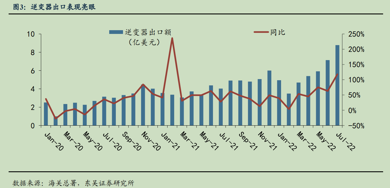 东吴证券分析师曾朵红在8月21日发布的研报中指出,欧洲能源基金电价新高需求持续火爆、国内分布式持续火爆外大基地项目抓紧建设、美国《通胀削减法案》延长ITC 10年加速光伏发展,预计2022年全球光伏装机250GW,同增50%,全面看好光伏板块成长,7月逆变器出口金额环比增长23%,超市场预期,尤其看好逆变器、组件环节。