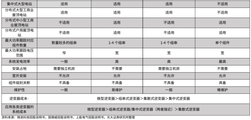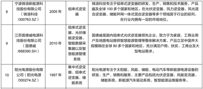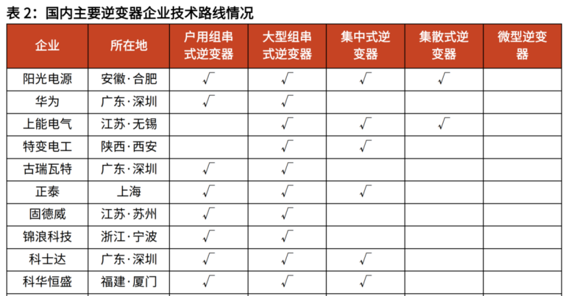 国内逆变器企业中,阳光电源布局户用组串式逆变器、大型组串式逆变器、集中式逆变器、集散式逆变器;上能电气布局大型组串式逆变器、集中式逆变器、集散式逆变器;特变电工布局大型组串式逆变器、集中式逆变器;固德威布局户用组串式逆变器、大型组串式逆变器;锦浪科技布局户用组串式逆变器、大型组串式逆变器;禾迈股份和昱能科技布局微型逆变器。