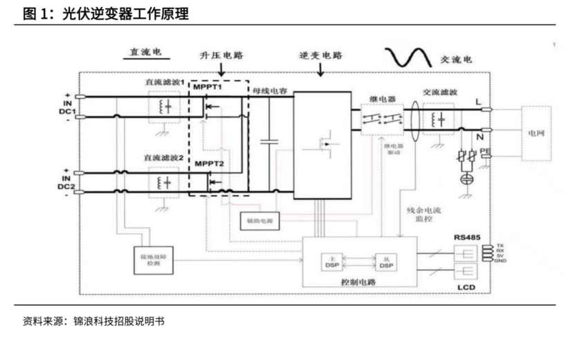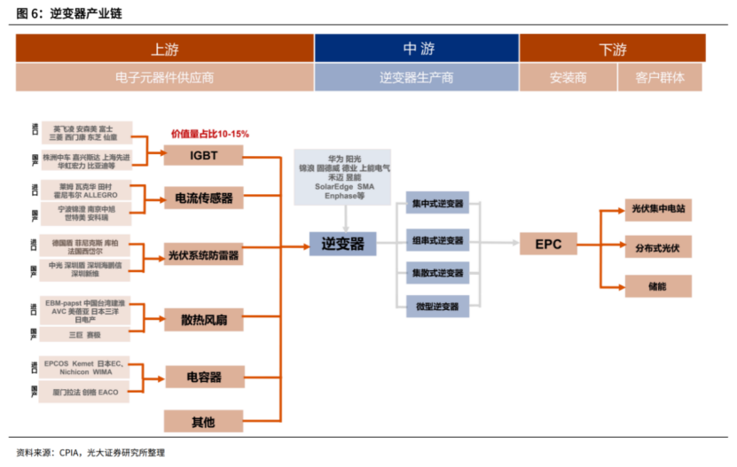 光伏逆变器产业链上游包括电子元器件(IGBT、电容、电阻、电抗器、PCB等)、结构件(机柜、机箱等)和辅助材料等制造环节,涉及范围较广。中游指光伏逆变器制造,下游主要包括光伏系统集成商、光伏系统安装商、EPC承包商、光伏项目投资业务等。