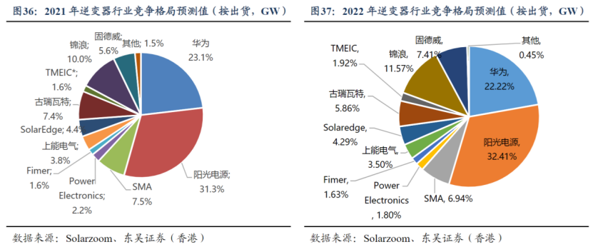 逆变器行业集中度高,东吴证券曾朵红等人在8月10日发布的研报中表示,阳光电源光伏逆变器市占率自2015年起首次超过SMA,此后居于全球第二位,仅次于华为。2021年光伏逆变器全球市占率排序:阳光>华为>锦浪>SMA>古瑞瓦特>固德威>SolarEdge。