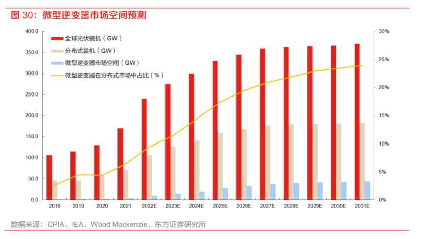东方证券卢日鑫等人在8月8日发布的研报中表示,推测微型逆变器在分布式市场中依靠其安全性、发电效率、可靠性以及灵活性等方面的优点叠加全球光伏组件级电力电子安全要求持续深化,微型逆变器于分布式光伏市场渗透率有望由9%提升至19%,预计2026年,微型逆变器年出货量有望达33GW。