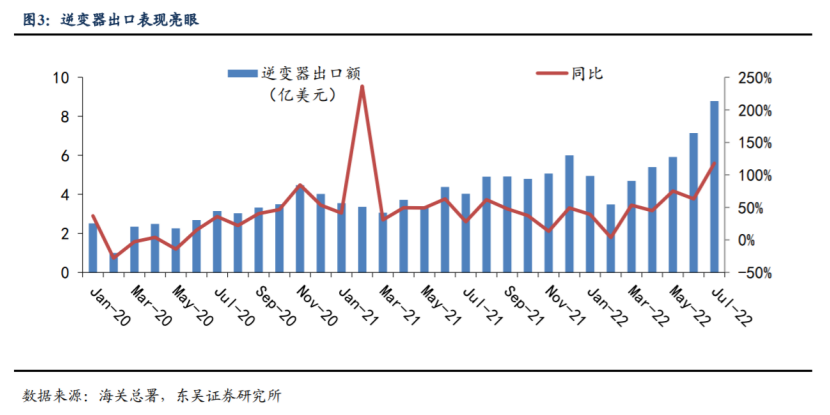 下午,工信部等五部门联合印发加快电力装备绿色低碳创新发展行动计划。推进太阳能(000591)等10个领域电力装备绿色低碳发展,研发高电压、高功率、高效散热的逆变器以及智能故障检测、快速定位等关键技术。东吴证券(601555)曾朵红等人在8月21日发布的研报中表示,7月逆变器出口金额环增23%,超市场预期。
