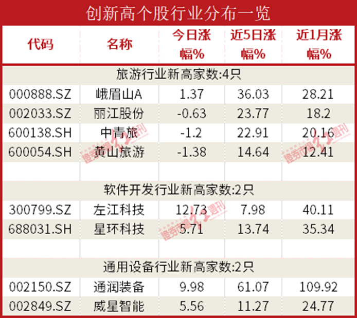 今日新高股有达28只,旅游有4只个股创近3年新高,另外软件与通用设备各有2只新高个股。昨天提示的中国科传(601858)今日开板大跌7.95%,而中国移动再创上市新高。