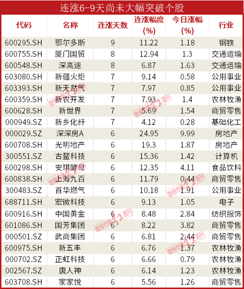 据以往的统计,能够连续6天以上上涨,而且累计涨幅在5%~25%之间的个股之后会有很大概率向上突破。昨日8连涨中鄂尔多斯(600295)今天走出9连涨,仍有突破的可能。昨日7连涨的7只个股中厦门国贸(600755)与深高速(600548)2只个股走出8连涨,另外今天有19只股票连续6-7天上涨。