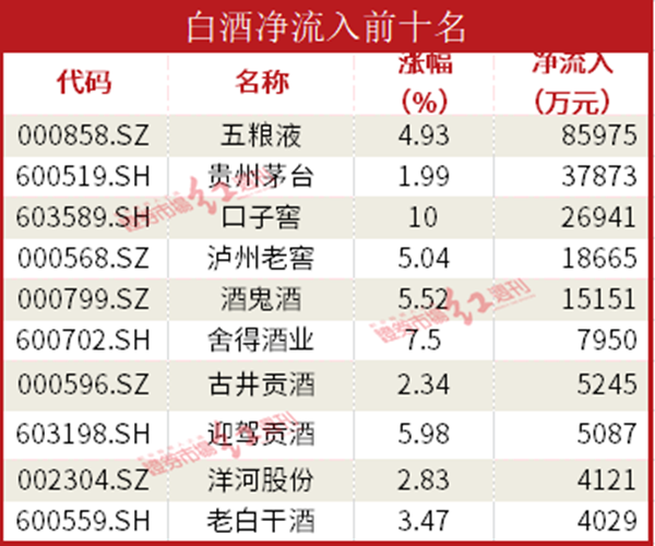 今日白酒板块集体大幅高开震荡,资金主要流入2只龙头股:五粮液与贵州茅台(600519),分别流入8.6亿元与3.8亿元,两者合计流入12.4亿元,超过整个板块流入额的一半。